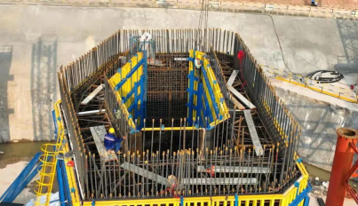 9米節(jié)段液壓爬模的使用是一次挑戰(zhàn)、一次跨越、一次革命。標(biāo)志著主塔施工裝備邁上了新臺(tái)階,為實(shí)現(xiàn)主塔智能化、綠色化、快速化建造,項(xiàng)目部開(kāi)展了各項(xiàng)創(chuàng)新研究。一是采用大噸位高爬架液壓爬模,架體連成整體,在爬升、澆筑中更加平穩(wěn)、安全。二是配置液壓脫合模系統(tǒng),替代傳統(tǒng)手動(dòng)機(jī)械脫模,提高了脫模工效。三是采用智能液壓控制系統(tǒng),實(shí)現(xiàn)同步爬升。配置視頻、風(fēng)速、壓力、位移等信息反饋智能監(jiān)控系統(tǒng),實(shí)現(xiàn)對(duì)結(jié)構(gòu)、環(huán)境、養(yǎng)護(hù)實(shí)時(shí)監(jiān)測(cè)。四是自帶智能養(yǎng)護(hù)系統(tǒng),實(shí)現(xiàn)混凝土冬季自動(dòng)蒸養(yǎng),其他季節(jié)造霧養(yǎng)護(hù)。五是設(shè)置專(zhuān)用電纜線(xiàn)槽、豎直旋梯、衛(wèi)生間、消防水箱、專(zhuān)用排污管道,實(shí)現(xiàn)標(biāo)準(zhǔn)化作業(yè)、綠色施工。