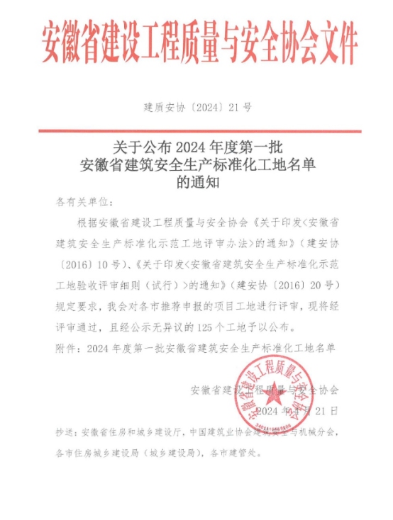 4月21日,安徽省建設(shè)工程質(zhì)量與安全協(xié)會公布了2024年度第一批安徽省建筑安全生產(chǎn)標(biāo)準(zhǔn)化工地名單,由銅陵交投置業(yè)有限公司開發(fā)建設(shè)的鳳起宸鳴府項(xiàng)目喜獲“安徽省建筑安全生產(chǎn)標(biāo)準(zhǔn)化示范工地”稱號。