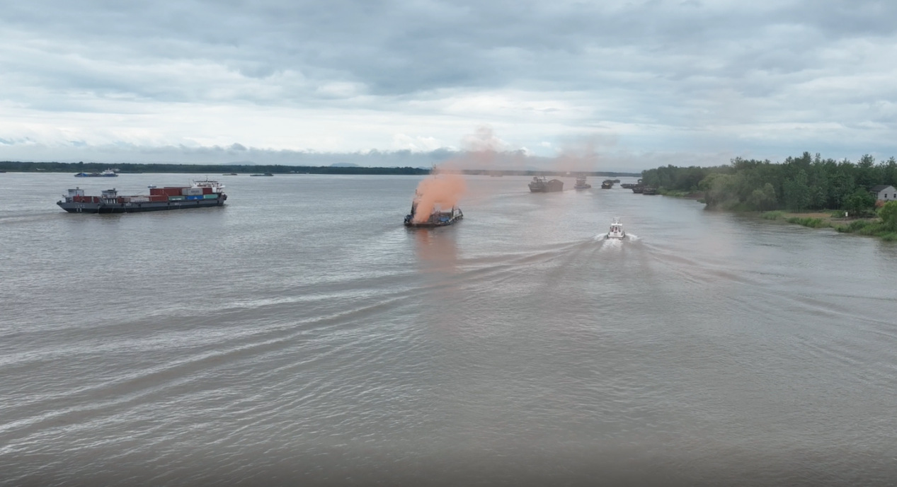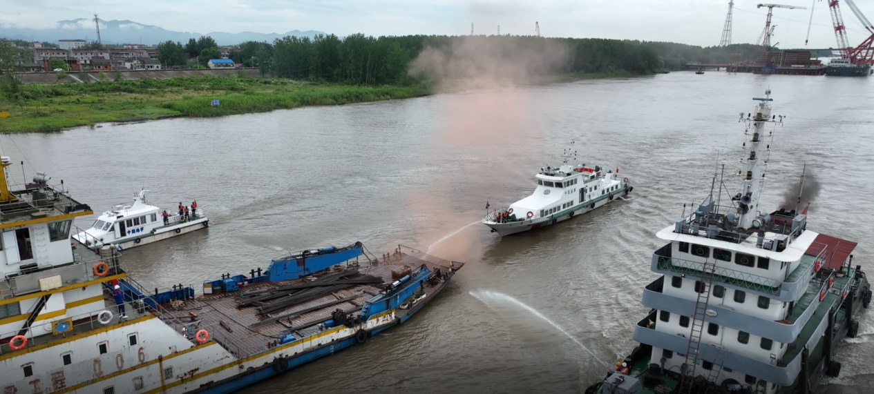 上午9點,演練正式開始,演練場景分為兩部分。首先模擬“橋梁工程006”船只在距3#平臺上游600m附近水域因船舶失火,導(dǎo)致船舶失控,有碰撞主塔3#墩鋼圍堰的危險。項目部立即啟動應(yīng)急預(yù)案,聯(lián)合銅陵海事處共同撲滅大火,并將失控船舶拖綁至安全位置。