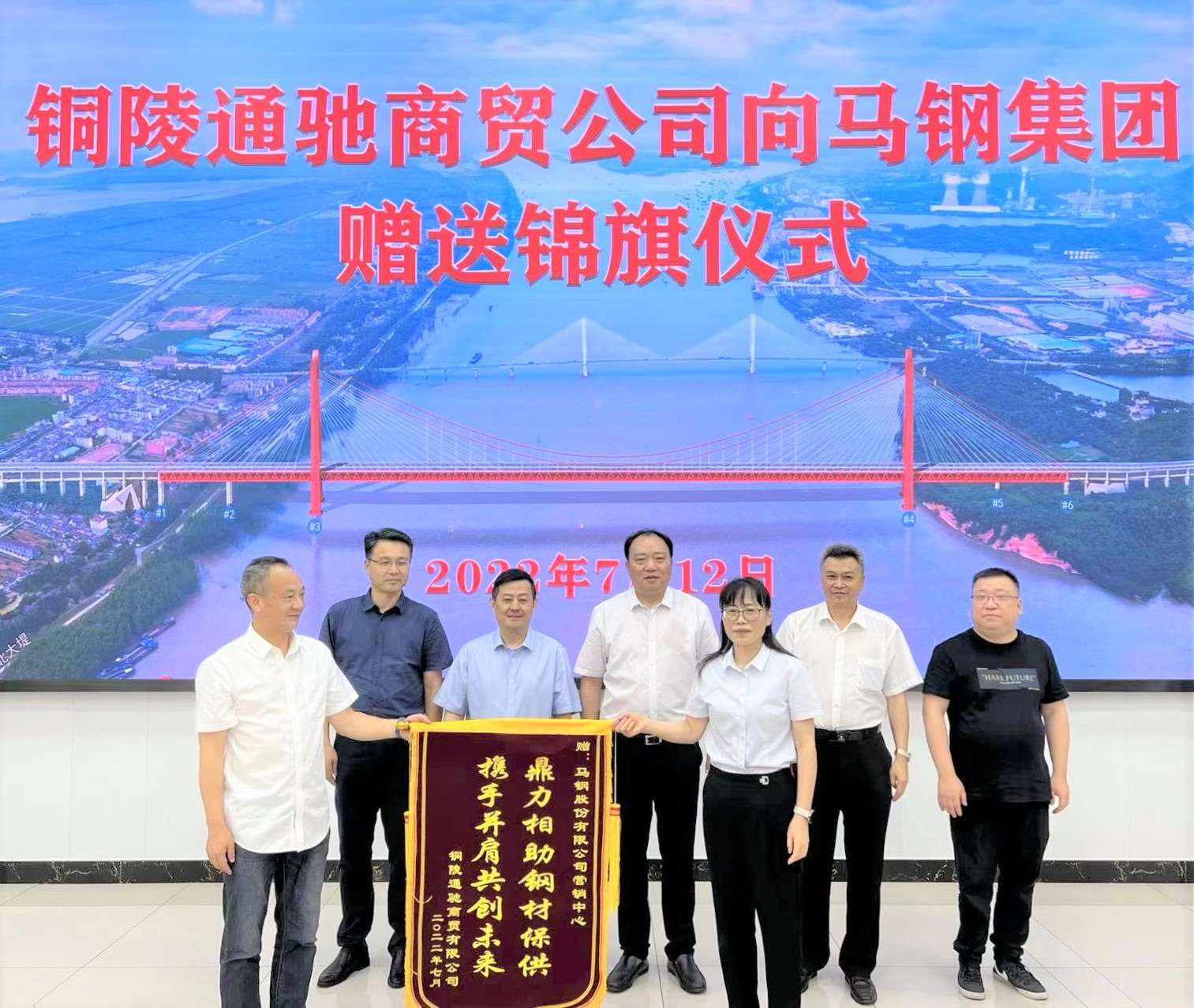 會談期間,通馳商貿(mào)向馬鋼集團贈送一面抒有“鼎力相助鋼材保供 攜手并肩共創(chuàng)未來”的錦旗,感謝馬鋼集團在疫情期間對G3公鐵橋材料保供工作做出的突出貢獻。