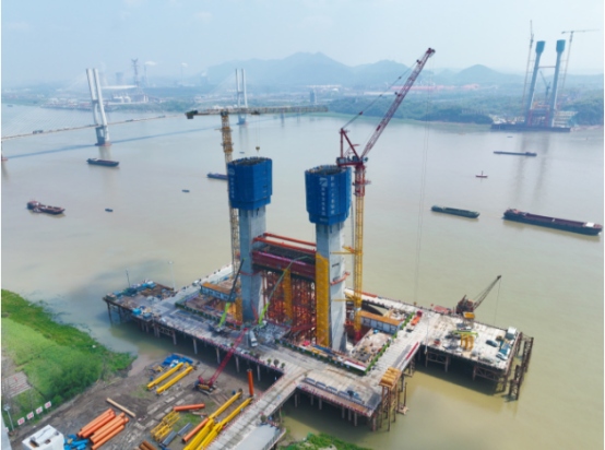 澆筑這樣一個巨大的“肩膀”一共需要2281立方米混凝土,分2層澆筑?!八┕な讋?chuàng)9米節(jié)段智能液壓爬模,把大橋主塔柱單次澆筑高度從傳統(tǒng)的6米一節(jié)躍升至9米一節(jié),不僅節(jié)省了大量的鋼筋接頭,而且在施工時間上較6米節(jié)段施工減少了12個輪次,提高了施工效率,這是橋梁施工工藝里程碑式的突破!”中鐵大橋局G3銅陵橋項目部一分部副經(jīng)理沈堅羽介紹。