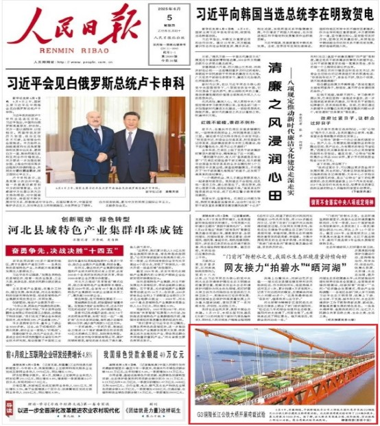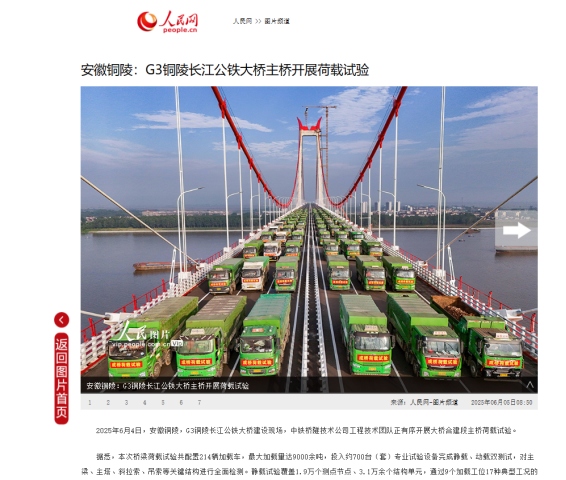 人民日報(bào)6月5日頭版報(bào)道《G3銅陵長江公鐵大橋開展荷載試驗(yàn)》