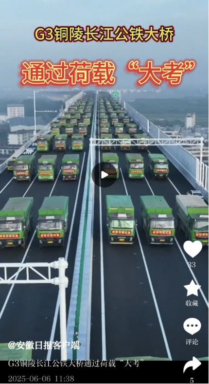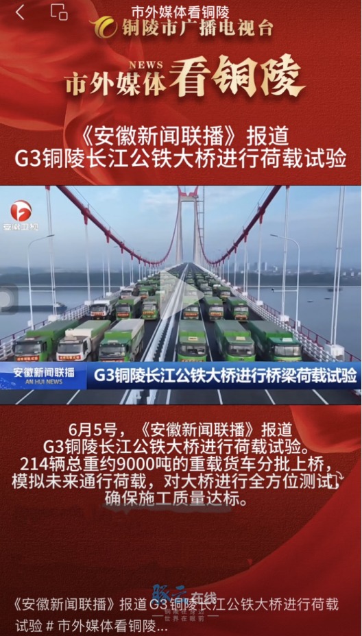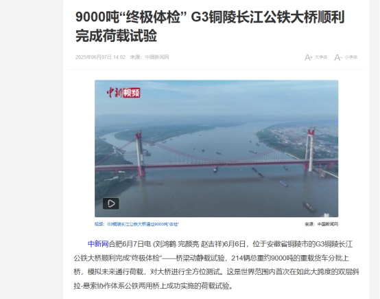 中國新聞網(wǎng)6月7日推出《9000噸“終極體檢” G3銅陵長江公鐵大橋順利完成荷載試驗(yàn)》