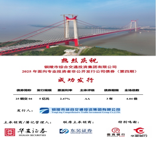 9月15日,市交投集團(tuán)成功簿記發(fā)行2025年第四期面向?qū)I(yè)投資者非公開公司債券,額度5億元,期限3年,票面利率2.47%,全場認(rèn)購倍數(shù)4.04倍。債券票面利率較1年期貸款市場報價利率(LPR)3.0%下降53個BP,綜合節(jié)約融資成本約795萬元。