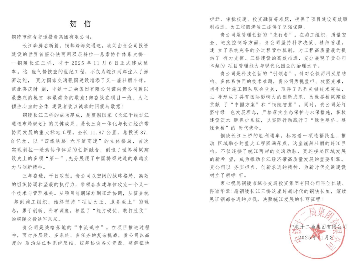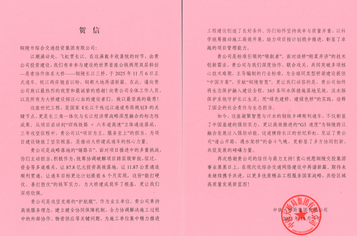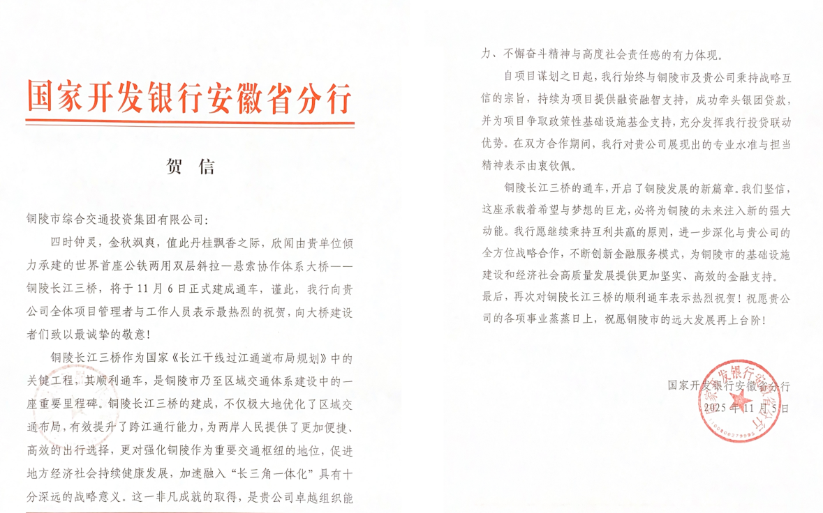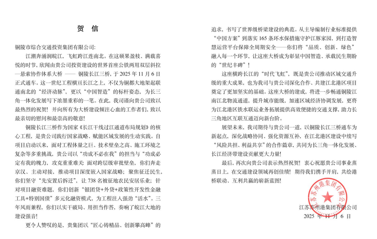 2025年11月6日,世界首座公鐵兩用雙層斜拉-懸索協(xié)作體系大橋——銅陵長江三橋正式通車!這一貫徹落實(shí)國家“一帶一路”、長江經(jīng)濟(jì)帶及長三角一體化發(fā)展戰(zhàn)略的重點(diǎn)工程,不僅刷新了橋梁建設(shè)的技術(shù)高度,更牽動(dòng)著各方合作伙伴的心弦:鑄就“橋魂”的中鐵大橋局、中鐵大橋院等、注入金融活水的國開行等、擬攜手開發(fā)江北港區(qū)項(xiàng)目的蘇州港集團(tuán),以及共建江北港鐵路專用線的中鐵十六局、二十局等單位,紛紛致信銅陵交投集團(tuán),以賀信為禮,共慶這一改寫區(qū)域交通格局的歷史時(shí)刻。?