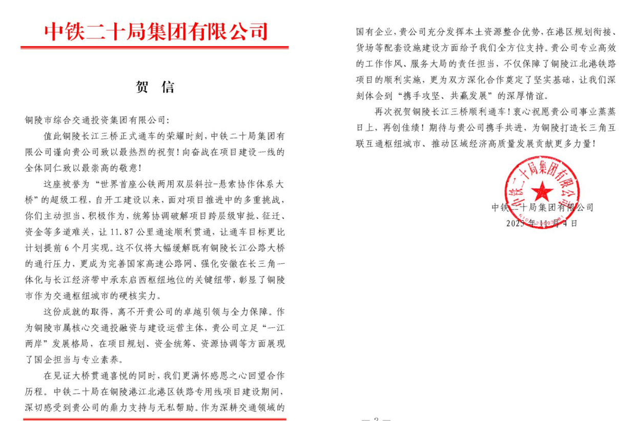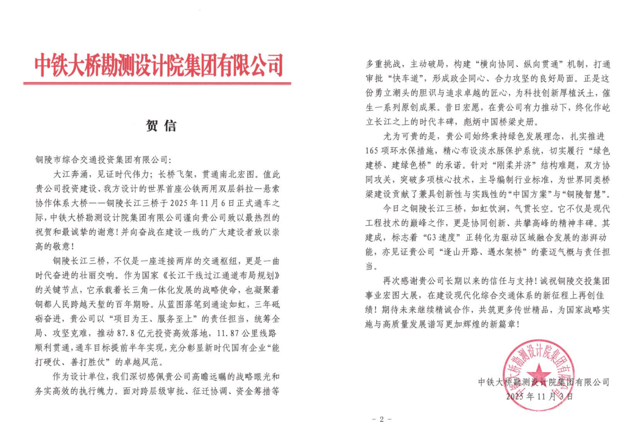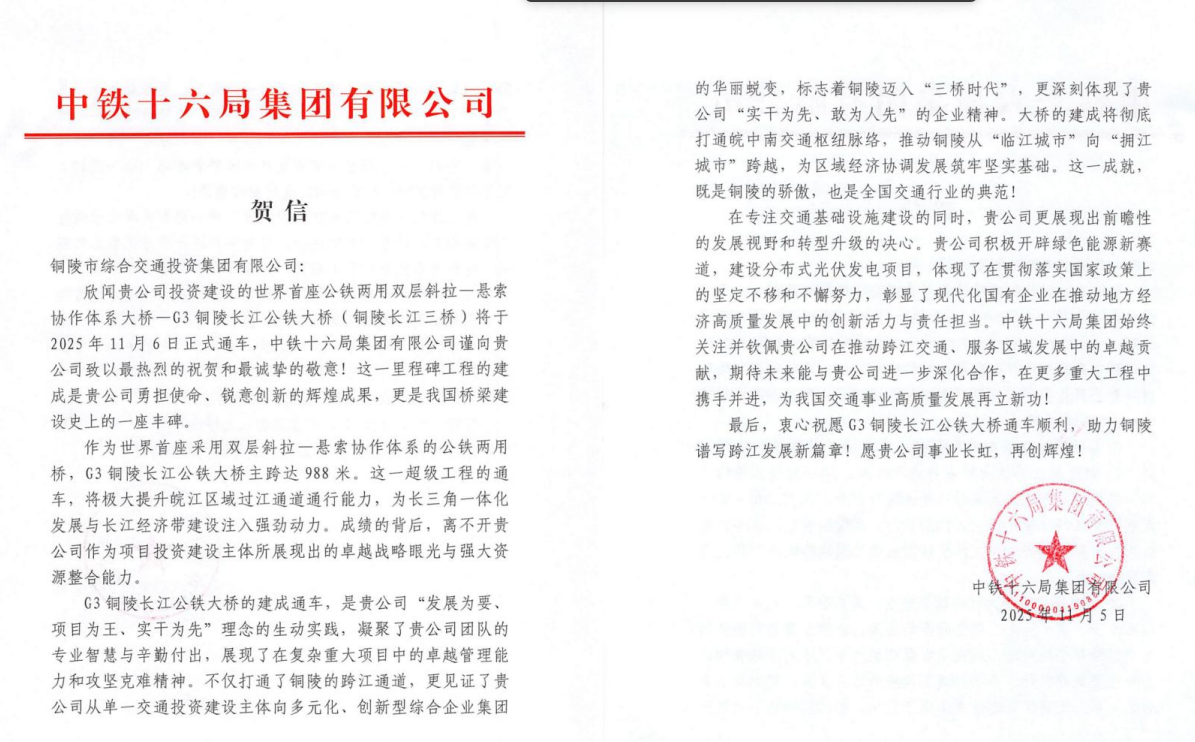 2025年11月6日,世界首座公鐵兩用雙層斜拉-懸索協(xié)作體系大橋——銅陵長江三橋正式通車!這一貫徹落實(shí)國家“一帶一路”、長江經(jīng)濟(jì)帶及長三角一體化發(fā)展戰(zhàn)略的重點(diǎn)工程,不僅刷新了橋梁建設(shè)的技術(shù)高度,更牽動(dòng)著各方合作伙伴的心弦:鑄就“橋魂”的中鐵大橋局、中鐵大橋院等、注入金融活水的國開行等、擬攜手開發(fā)江北港區(qū)項(xiàng)目的蘇州港集團(tuán),以及共建江北港鐵路專用線的中鐵十六局、二十局等單位,紛紛致信銅陵交投集團(tuán),以賀信為禮,共慶這一改寫區(qū)域交通格局的歷史時(shí)刻。?