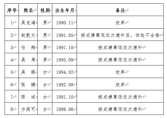 因出現(xiàn)部分考生自愿放棄情況,我公司對(duì)入圍體檢人員按照成績(jī)排名依次進(jìn)行遞補(bǔ)。現(xiàn)將交投集團(tuán)司屬公司銅陵市江北公路管理有限責(zé)任公司收費(fèi)員、監(jiān)控員崗位招聘遞補(bǔ)入圍體檢人員名單公告如下:
