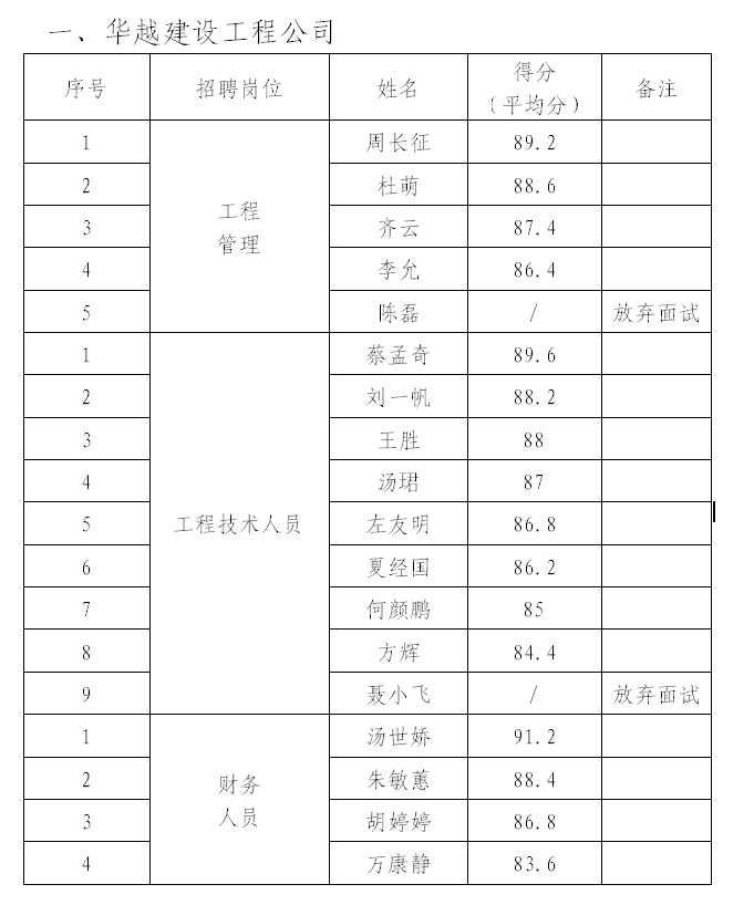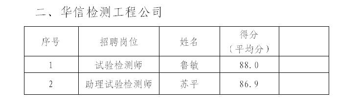 根據(jù)《銅陵華越建設工程有限公司公開招聘人員公告》、《銅陵市華信工程質(zhì)量檢驗有限責任公司公開招聘人員公告》,于3月1日開展招聘人員面試工作,現(xiàn)將擬招錄人員公示如下: