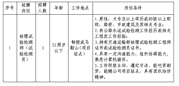 銅陵市綜合交通投資集團有限公司司屬全資子公司銅陵市華信工程質量檢驗有限責任公司因經(jīng)營發(fā)展需要,現(xiàn)面向社會公開招聘若干名工作人員,現(xiàn)將具體事項公告如下: