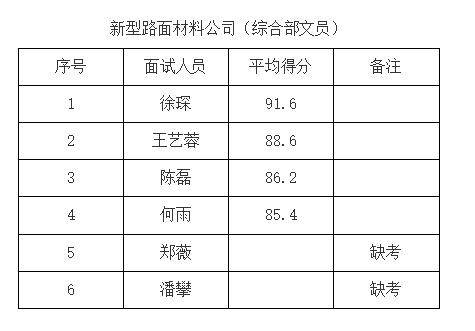 根據(jù)《銅陵市綜交新型路面材料有限責(zé)任公司公開(kāi)招聘人員公告》,我公司已于2021年9月5日開(kāi)展銅陵市綜交新型路面材料有限責(zé)任公司相關(guān)崗位面試工作,現(xiàn)將面試成績(jī)公示如下: