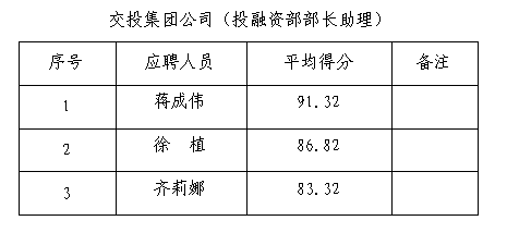 根據(jù)《銅陵市綜合交通投資集團(tuán)有限公司公開招聘人員公告》,我公司已于2022年3月9日開展銅陵市綜合交通投資集團(tuán)有限公司投融資部部長助理面試工作,現(xiàn)將報(bào)名參與人員面試成績公示如下: