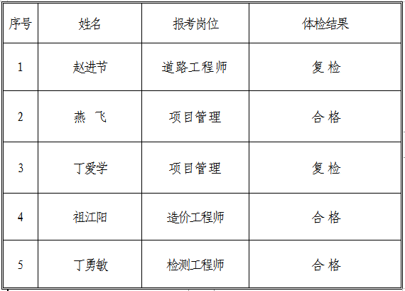 根據(jù)《銅陵市交通投資有限責(zé)任公司招聘人員公告》,集團(tuán)公司綜合部于2018年12月17日組織報(bào)考道路工程師、項(xiàng)目管理、造價(jià)工程師職位的考生參加體檢,現(xiàn)將相關(guān)體檢結(jié)果向社會(huì)進(jìn)行公示: