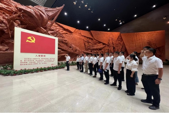 在渡江戰(zhàn)役紀念館內,G3公鐵橋項目部第一黨支部書記趙懿帶領全體黨員同志,面向黨旗,高舉右拳,莊嚴宣誓,在字字鏗鏘中重溫入黨誓詞,抒發(fā)對黨忠誠的堅定決心。黨員同志在講解員的帶領下,依次參觀戰(zhàn)前形勢、戰(zhàn)役準備、突破江防、戰(zhàn)役勝利、人民支前和英烈業(yè)績六大展廳,通過大量實物、圖片和文物資料,與歷史“對話”,與英雄“交流”,感受西梁山戰(zhàn)役的英勇、搶灘登陸的緊迫、烈士名錄廳的沉重,深刻感悟黨團結帶領人民歷經千難萬險攻克難關,創(chuàng)造奇跡的革命歷程。