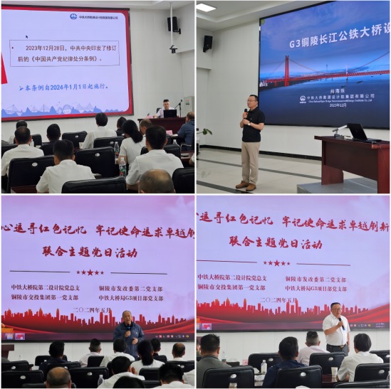 現(xiàn)場參觀過后,在G3大橋項目部會議室,中鐵大橋院黨建工作部部長劉建軍、中鐵大橋院總工程師、G3銅陵長江公鐵大橋總設計師肖海珠分別以《中國共產(chǎn)黨紀律處分條例》解讀、斜拉懸索協(xié)作體系橋設計為題作了輔導講座,并與聯(lián)合單位進行了交流探討。集團公司黨委副書記方勁松、中鐵大橋局G3項目部經(jīng)理劉幸福參與交流。