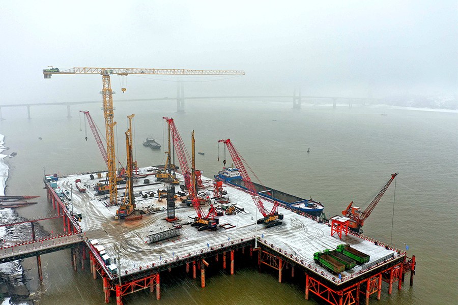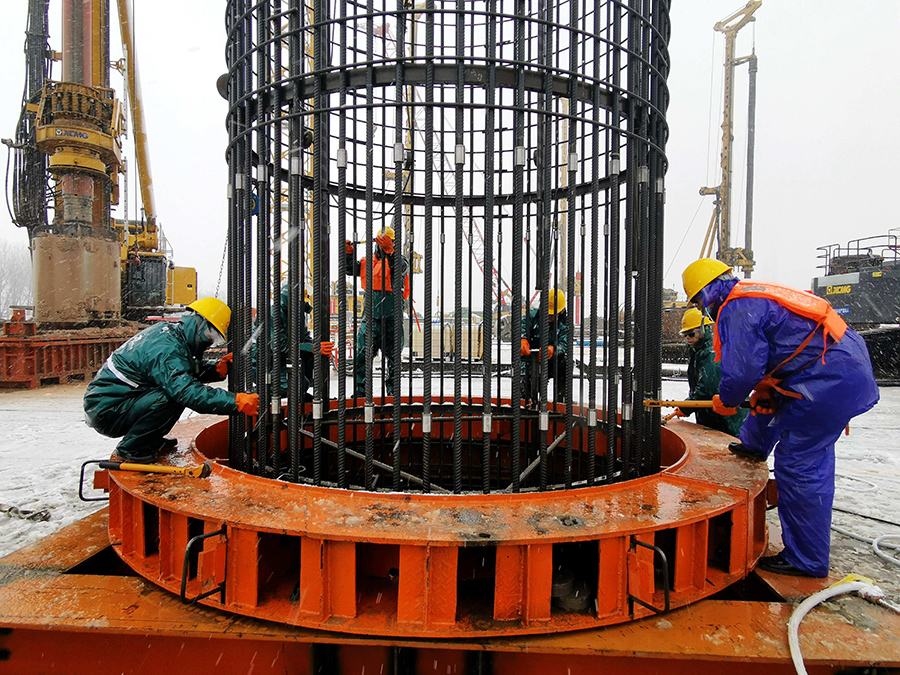 人民網(wǎng)合肥2月9日電(陳浩)虎年上班首日,安徽銅陵出現(xiàn)降雪天氣,但建設者的熱情沒有絲毫減弱。為確保G3銅陵長江公鐵大橋建設進度,施工人員頂風冒雪為大橋3號主墩安裝鉆孔樁鋼筋籠。