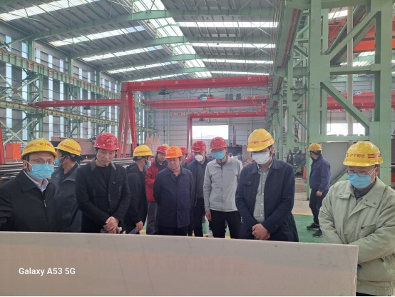 湯世才一行首先前往驗收現(xiàn)場,詳細了解了鋼錨梁首件制造、拼裝過程、結構特點及重難點分析等內容,并前往施工車間查看了主梁的生產進度。