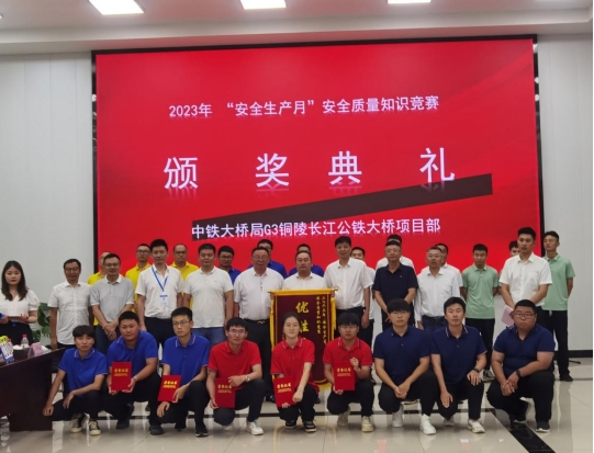 6月30日,G3銅陵長江公鐵大橋開展“安全生產(chǎn)月”安全質(zhì)量知識(shí)競(jìng)賽活動(dòng)。銅陵長江公鐵大橋投資有限公司執(zhí)行董事、總經(jīng)理湯世才,副總經(jīng)理李春雨出席活動(dòng),并與全過程項(xiàng)目管理辦公室負(fù)責(zé)人潘波,鐵科院監(jiān)理總監(jiān)王勛文,合肥工大監(jiān)理副總監(jiān)王祥,項(xiàng)目經(jīng)理劉幸福,總工程師姚森,安全總監(jiān)周啟輝組成裁判組。