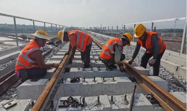 銅陵江北港鐵路專用線項目迎來關(guān)鍵節(jié)點。5月25日,在章家院特大橋施工現(xiàn)場,隨著第一根25米長鋼軌穩(wěn)穩(wěn)落入軌枕承軌槽內(nèi),標(biāo)志著銅陵江北港鐵路專用線項目正式進(jìn)入鋪軌施工階段。